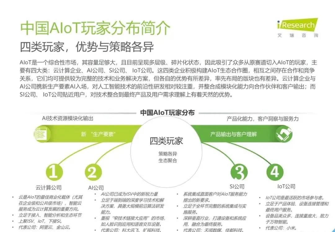 白皮書指出,AIoT是一個(gè)綜合性市場,其容量足夠大,且目前呈現(xiàn)多層級(jí)、碎片化狀態(tài),因此吸引了眾多從原賽道切入AIoT的玩家,主要有四大類:云計(jì)算企業(yè)、AI公司、SI公司、IoT公司。艾瑞推測,受益于智能家居場景的率先爆發(fā),2019年物聯(lián)網(wǎng)連接量將達(dá)45.7億,而后由于5G的商用,低功耗廣域物聯(lián)網(wǎng)的超廣覆蓋,中國物聯(lián)網(wǎng)連接量將增至2025年的199億。